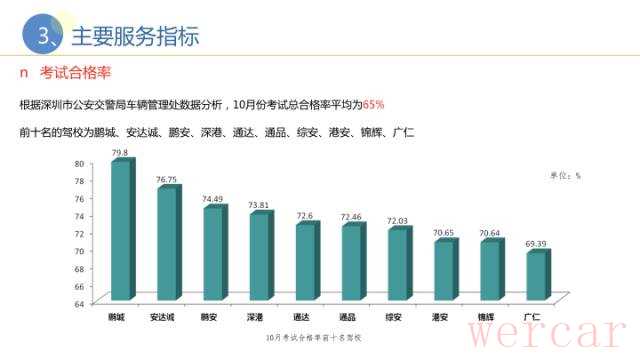 根据深圳市公安交警局车辆管理处数据分析,10月份考试总合格率平均为65%。合格率排名前十的驾校为鹏城、安达诚、鹏安、深港、通达、通品、综安、港安、锦辉、广仁 。