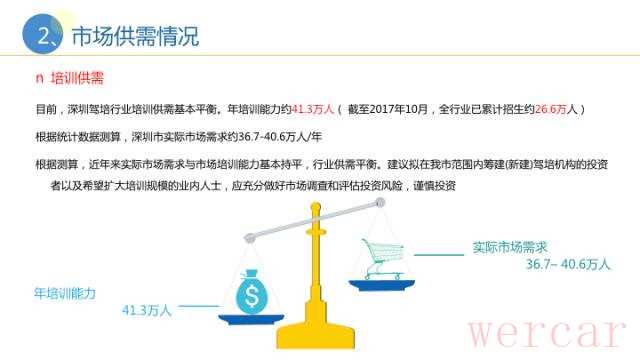 根据测算,深圳市驾培行业年培训能力约41.3万人(截至2017年10月,全行业已累计招生约26.6万人),而实际市场需求约36.7-40.6万人/年。可见,深圳市驾培实际市场需求与市场培训能力基本持平,行业供需平衡。