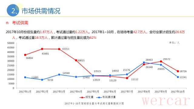 2017年10月份招生量约1.87万人,考试通过量约1.22万人。2017年1—10月,在培待考量42.7万人。全行业累计招生约26.6万人,考试通过量16.5万人,累计通过量与招生量比值为62%。(合理安排学车时间,会提高考试通过概率)