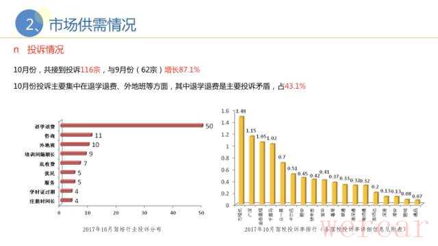 10月份共接到116宗投诉,与9月份(62宗)相比增长87.1% ,主要集中在退学退费、外地班等方面。