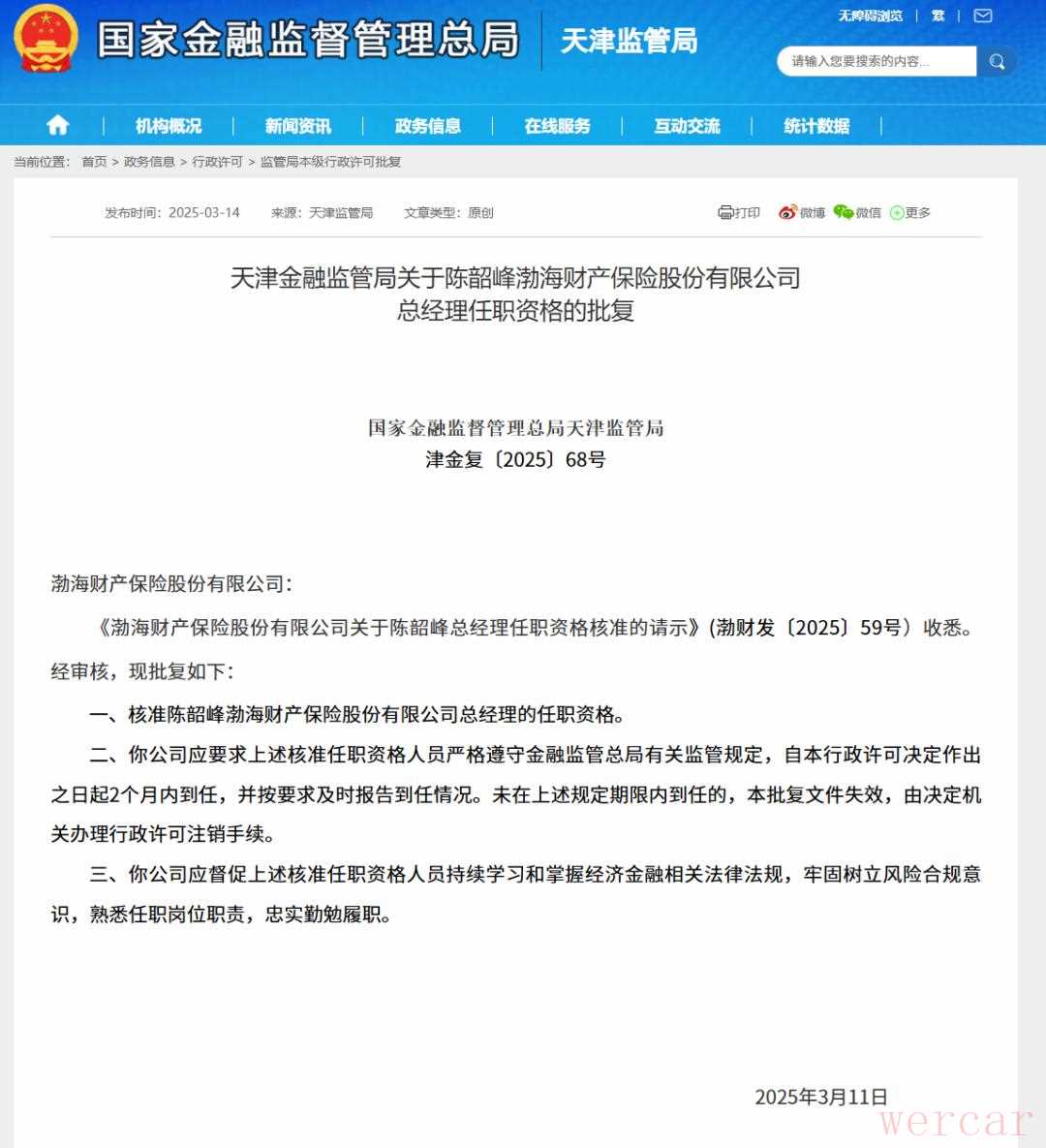 3月14日,国家金融监督管理总局天津监管局(津金复〔2025〕68号)核准了陈韶峰渤海财险总经理的任职资格。