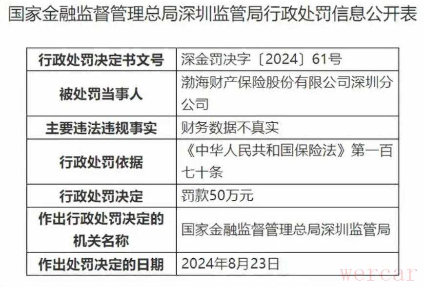 去年,违规现象频发。比如,同年8月,深圳监管局披露,渤海财险深圳分公司因财务数据不真实被罚款50万元,相关责任人也分别被处以10万元、7万元、7万元的罚款。