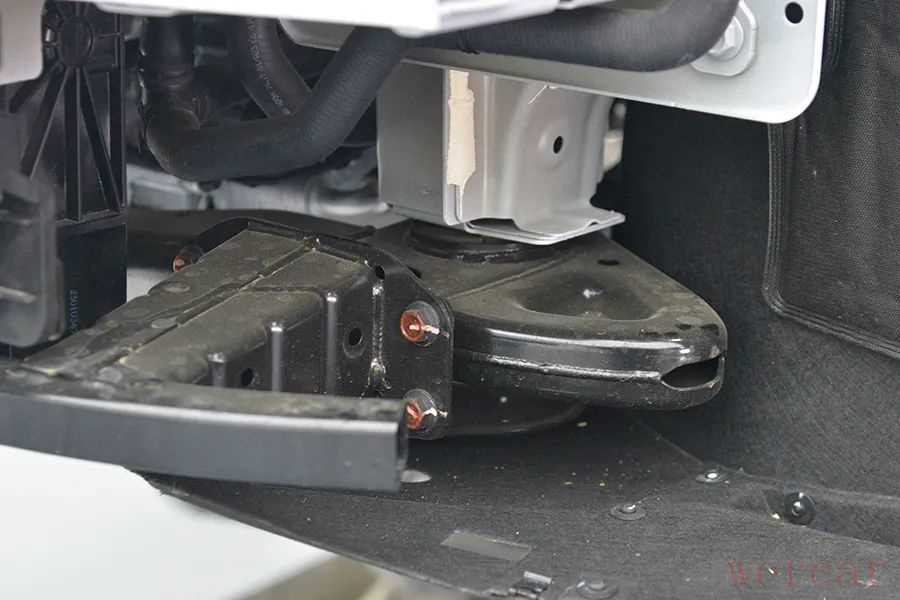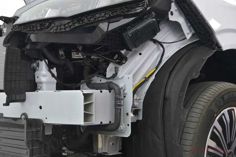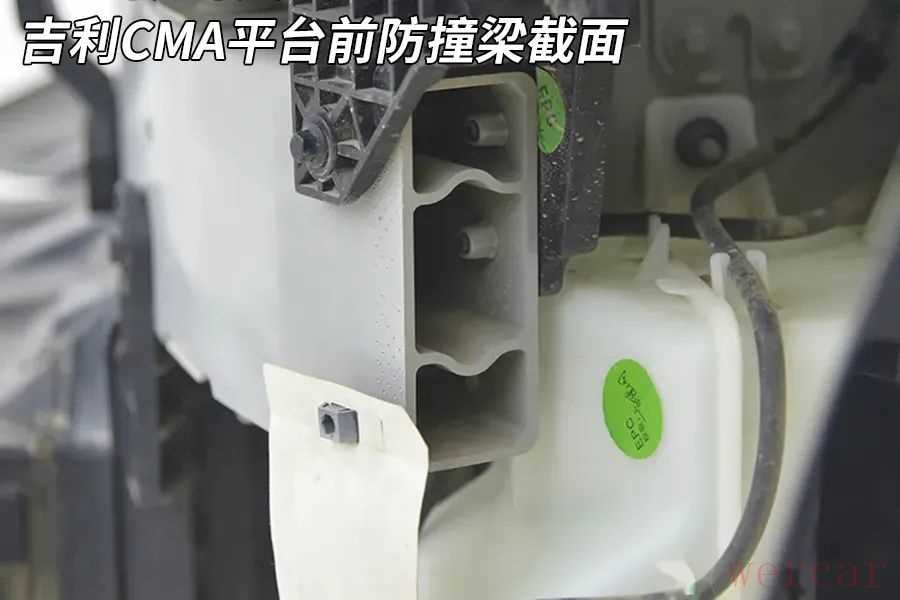 前防撞梁截面呈“目”字,不过中间两道横梁并不平行,能起到吸能作用,和吉利的“Ω”防撞梁的思路类似。