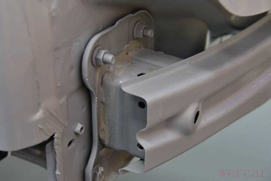 后吸能盒焊接和涂胶工艺一般,带有溃缩褶皱和打孔。