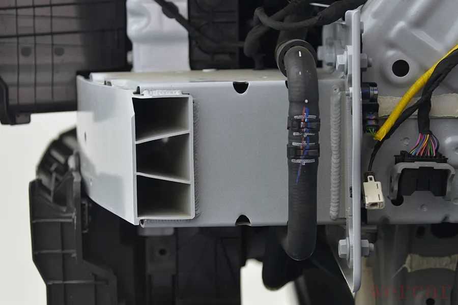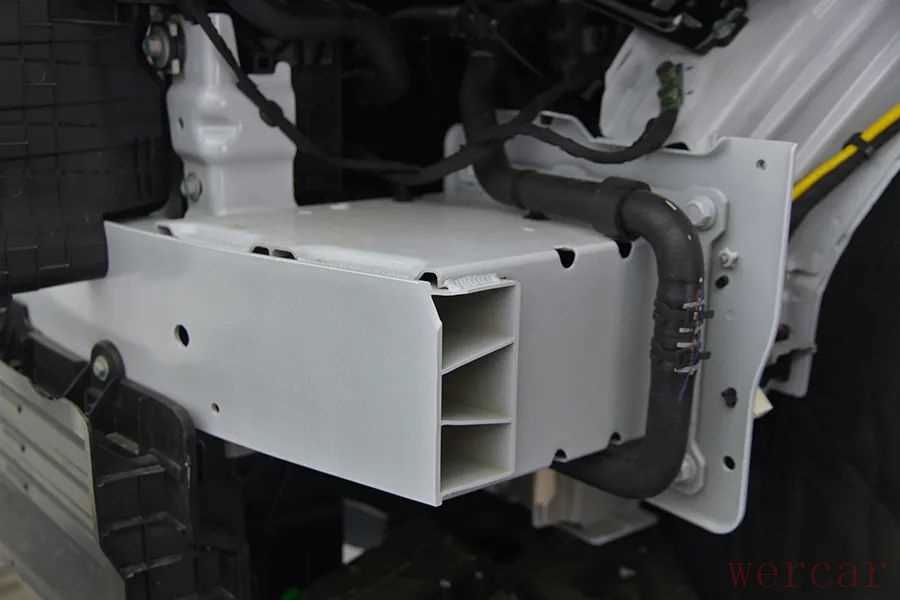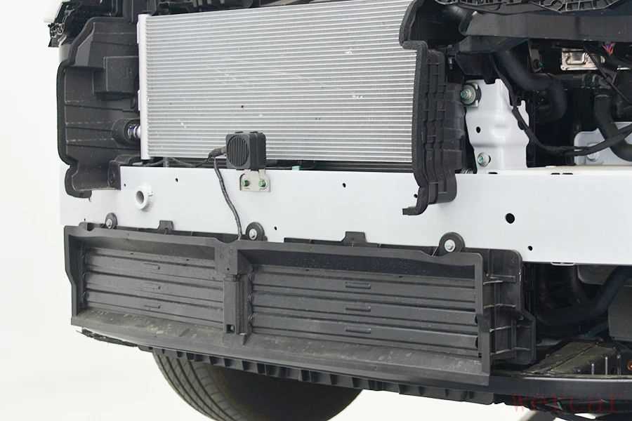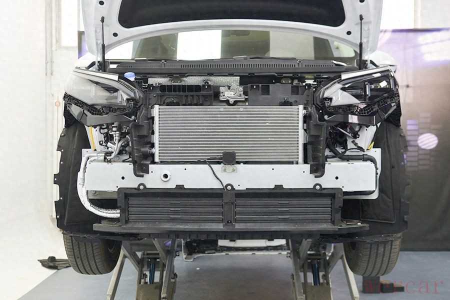 这辆车虽然设计了主动式进气格栅,但并没有设计导风槽,防撞梁上方的冷凝器就这么空着,说实话,不如将这个主动进气格栅取消,还能降低一些成本。