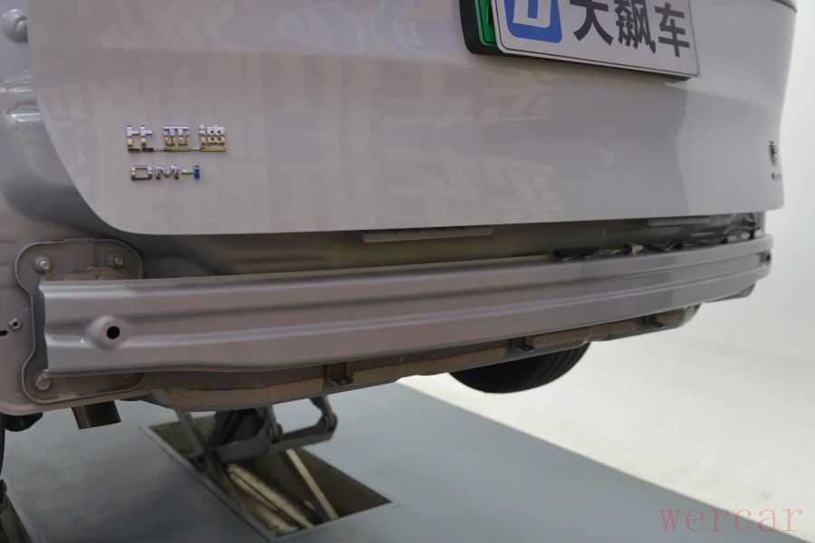 确实没想到这辆比亚迪夏的前防撞梁居然是铝合金材质,而且还是增强的“目”字形结构,比以往比亚迪车要进步很多,舍得花钱了!不过,相比前防撞梁,后防撞梁就显得有些寒酸,只是一根1毫米多一点的单层冲压钢板,还不是热成型钢,也没有凸出于后尾门。