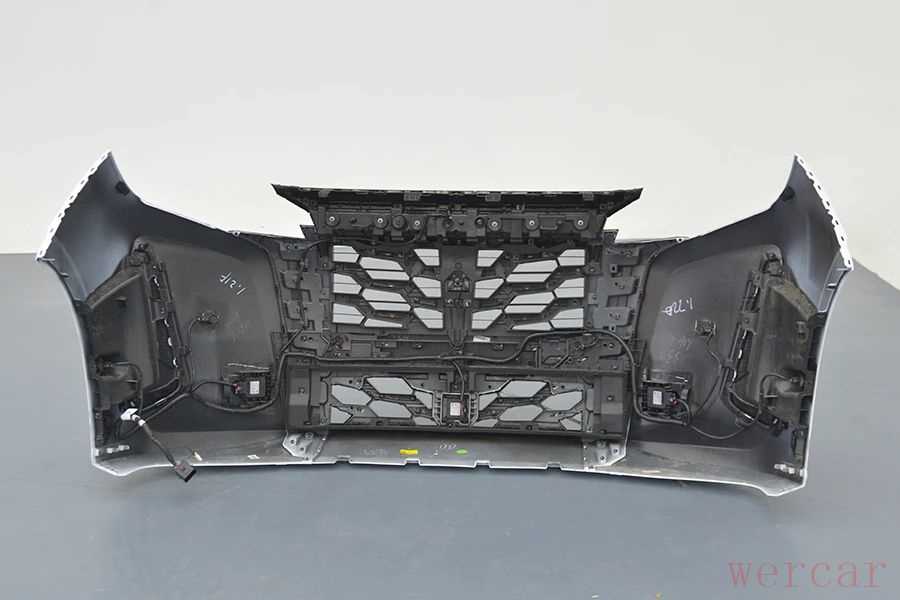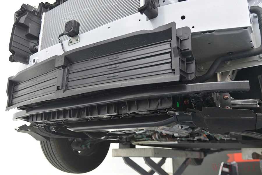 主动进气格栅下方有一个冲压钢板的副防撞梁,配有锥形吸能盒,带有溃缩打孔和褶皱。