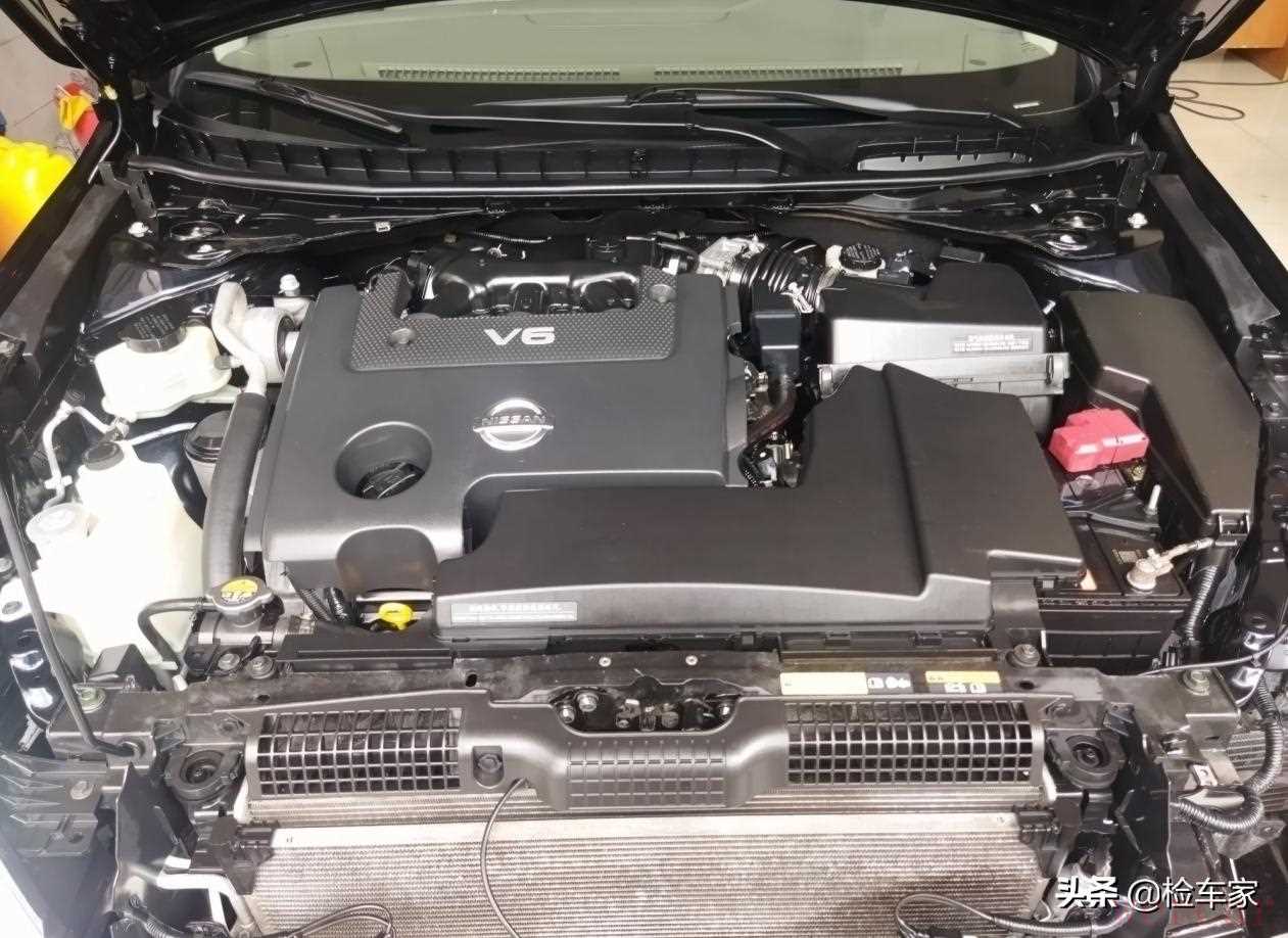 打开发动机舱,大家可以看一下,这个机舱看上去真不像10来年的老车,论翻新这块还得是二手车商啊!不过细节不行,摸一下满手油!这款天籁搭载的是一台2.5L,V6自然吸气发动机,回想现在现款小排量自吸及涡轮增压的车型,真不是一个档次的。马上来看看机舱的细节。