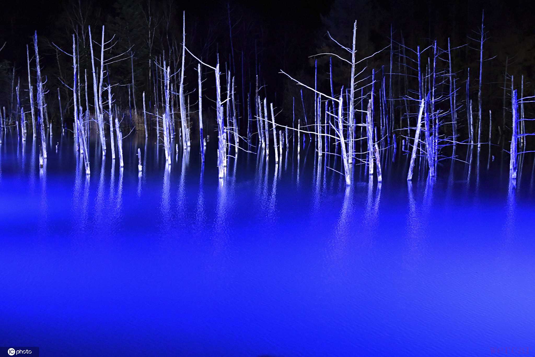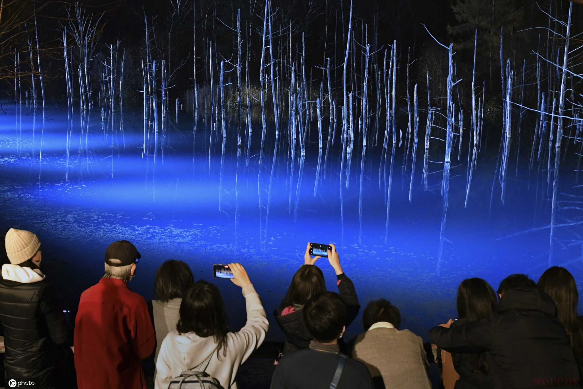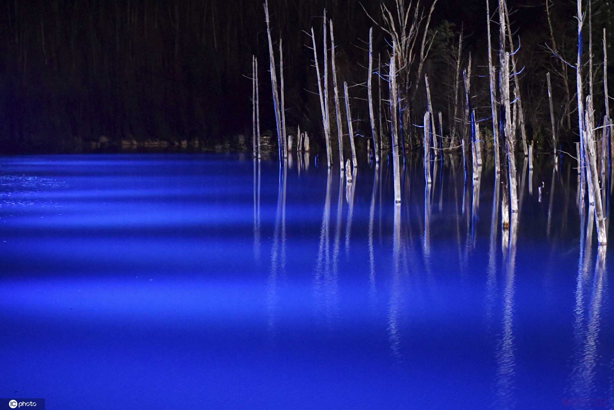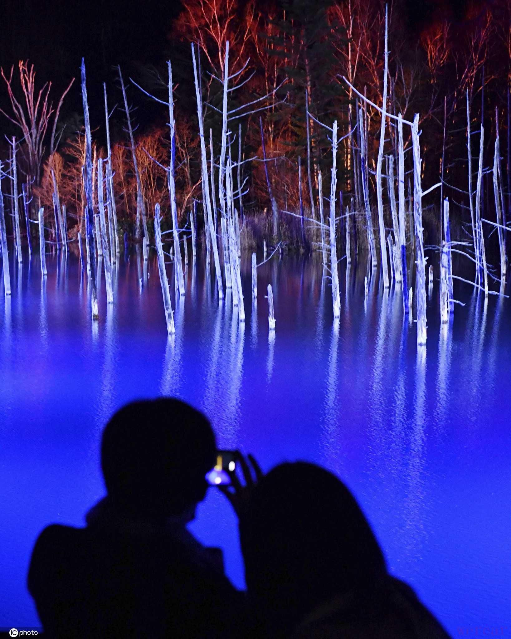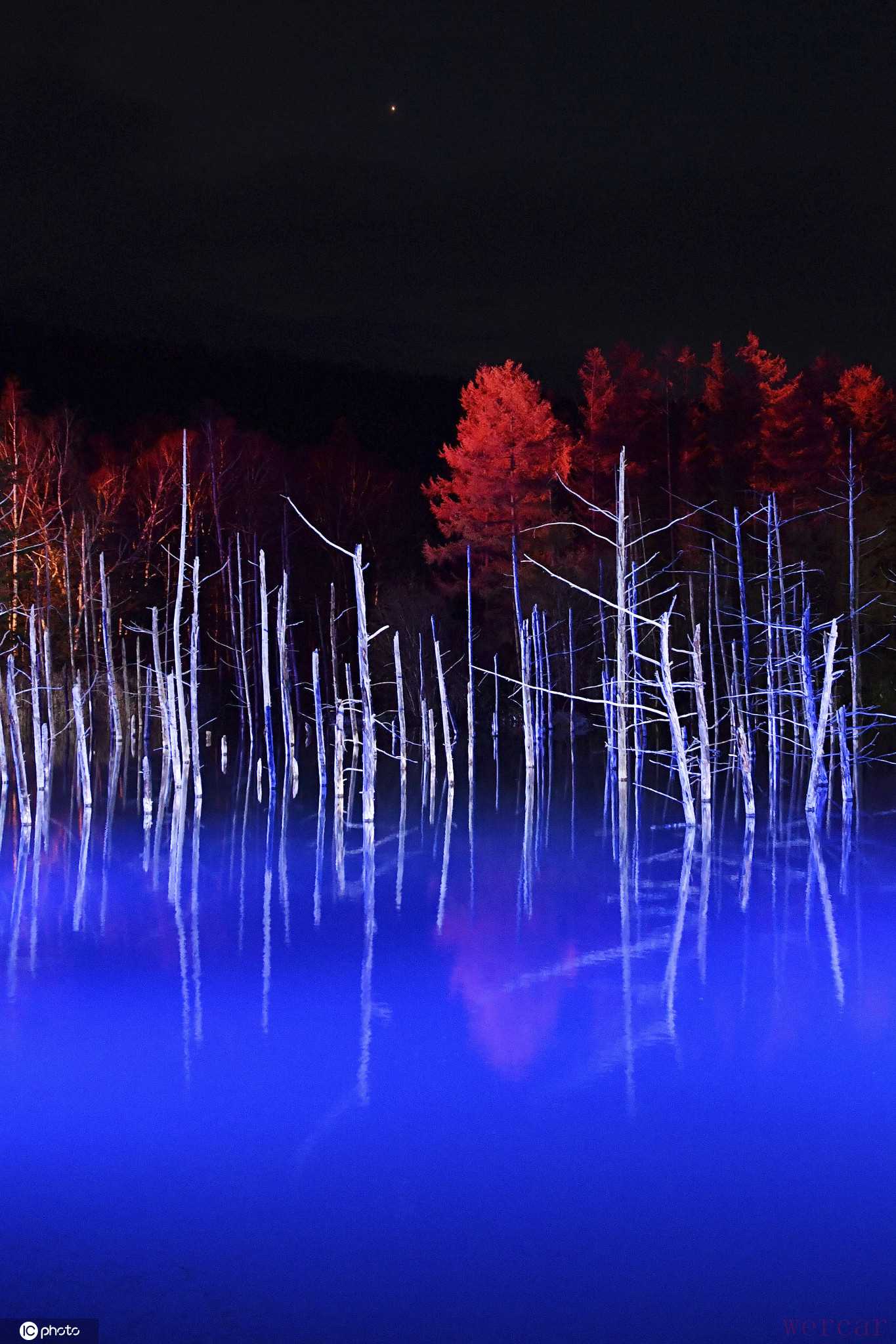 当地时间2020年11月1日,日本北海道美瑛町,当地著名的蓝色池塘举行灯光秀,迎接冬天到来,夜间满池蓝水美得让人舍不得眨眼,吸引游客和业余摄影师驻足拍照。(来源:东方ic)