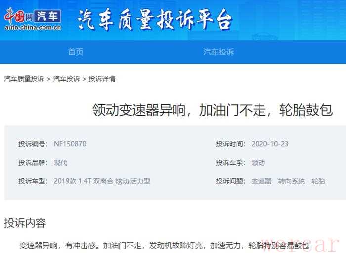 http://315.auto.china.com.cn/)接到了关于2019款北京现代领动1.4T双离合器变速箱的故障投诉。来自广州的车主潘先生表示,其领动1.4T双离合车型出现了变速箱异响、加油门不走等问题。