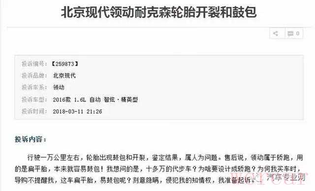 随着市场基数越来越大,领动的质量问题也逐渐的暴露出来。在第三方投诉网站有关领动的投诉也是五花八门,转向系统卡滞,轮胎鼓包开裂,车身异响,漆面起泡开裂,大灯进水,车身附件及电子故障等,其中轮胎鼓包开裂更是投诉中的重点。