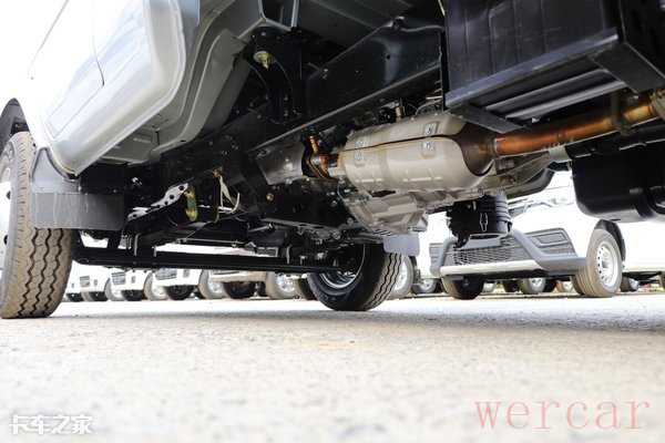 与发动机匹配的是蒙沃MG70 5挡手动变速箱,采用185R15LT规格轮胎,2.5吨后桥,前盘后鼓设计,液压油制动,速比5.375。