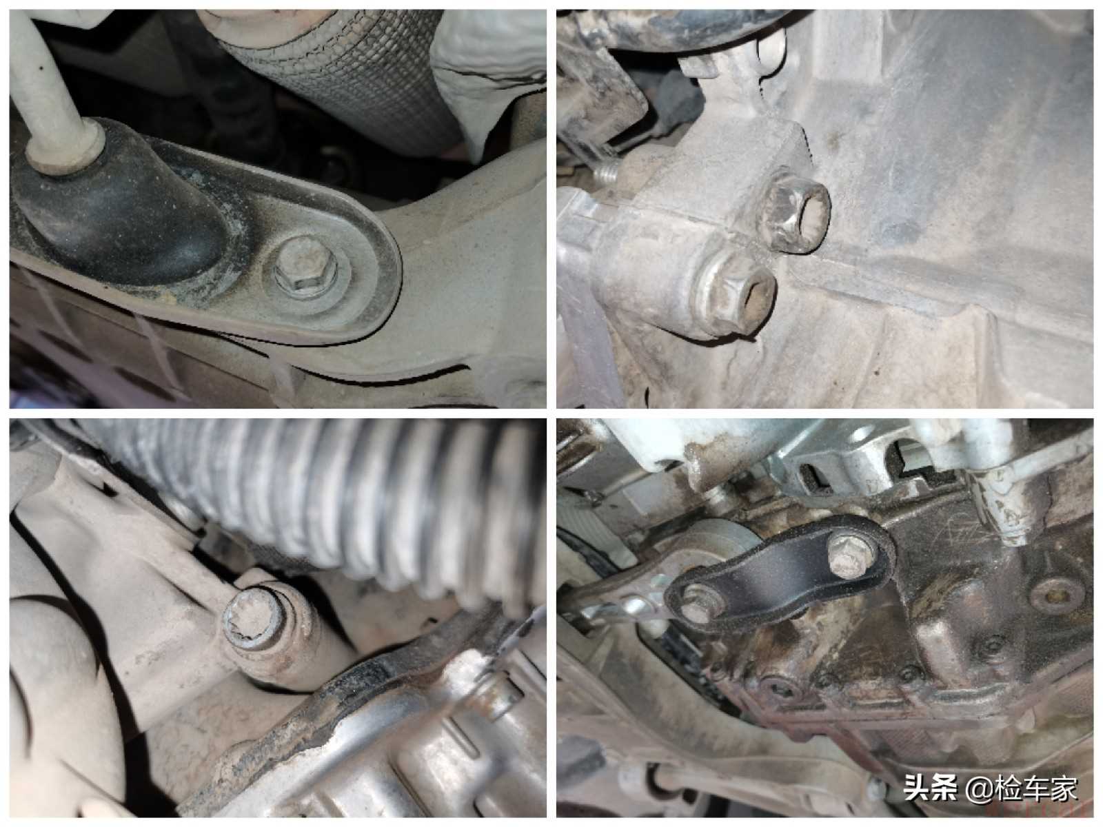 机舱部分首先对发动机和变速箱固定机脚支架进行检测,先检查的当然是连接发动机与车身的固定螺丝,俗称棘爪。棘爪还起到一个过滤震动共振的作用,所以说要是想要吊装发动机或者变速箱的话,棘爪就是必须要拆的。仔细观察棘爪螺丝有双向受力的拧动痕迹,不过由于年限的原因,棘爪出现了下沉老化的现象,共振频率加大,造成驾驶感受下降,这样的话就需要后期进行更换。而且气门室盖、进气管都有拆装痕迹,不过这些都是年限长、公里大的车子正常的维护保养。目前从上部观察倒是没有漏油渗油的痕迹,一会儿检测底盘的时候再观察一下。