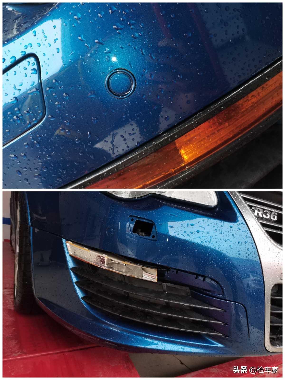 现在正式开始我们的检测,首先老规矩,我们还是先绕车辆一圈整体查看,来观察车辆的整体线条,车身筋线,覆盖件缝隙匀称程度。目前可以看到前杠有喷漆痕迹,右前雾灯饰板,大灯清洗饰板盖缺失,这种属于剐蹭导致的破损缺失,不是啥问题,下面拿出专业设备,查看漆面具体情况。