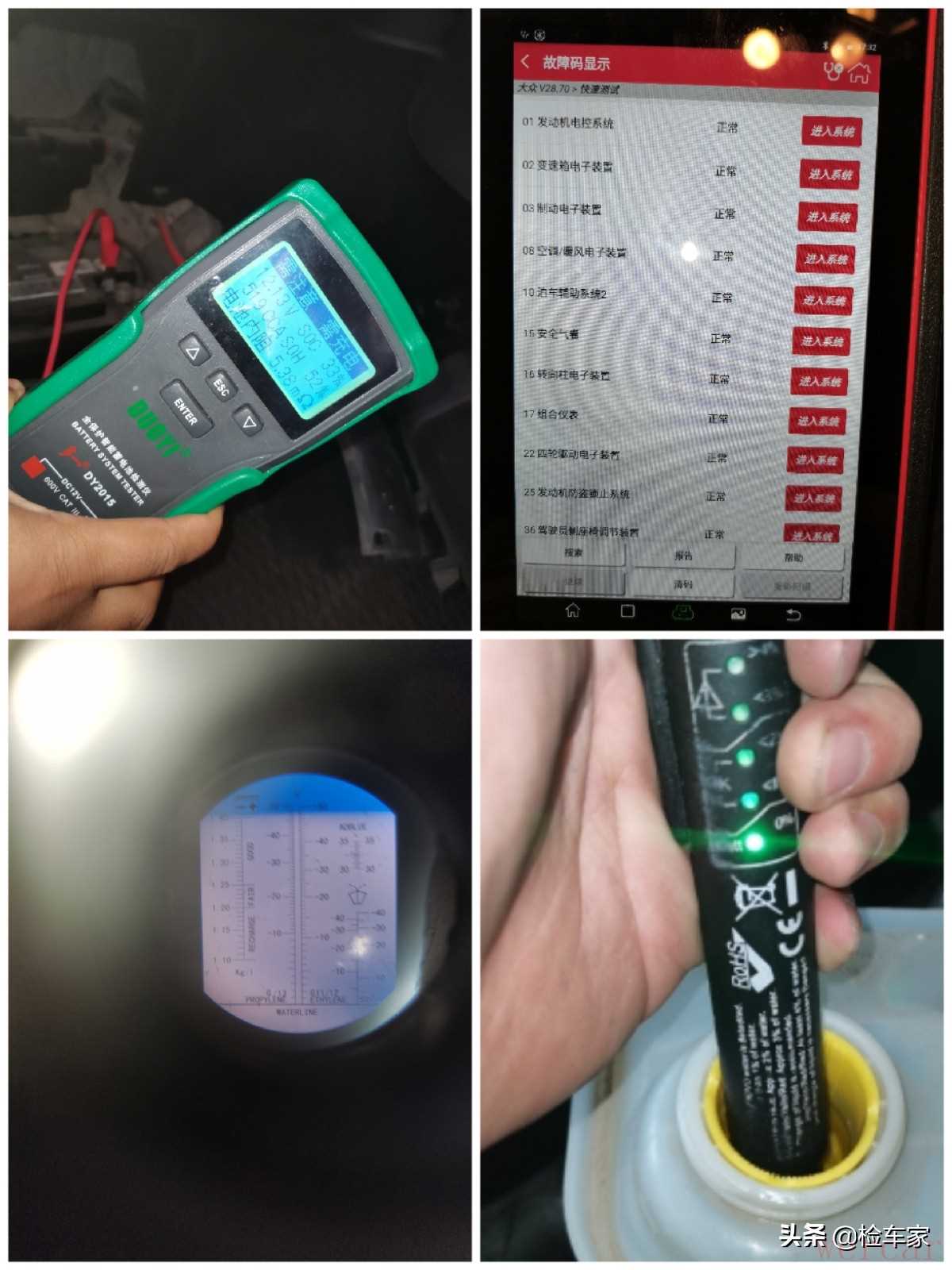 接下来拿出,电瓶检测仪、刹车油笔、防冻液检测仪,分别检测油电液是否在最佳工作状态。目前检测到除了电瓶是长时间停放原因,导致电量不足需充电以外,刹车油、防冻液都在最佳工作状态。后期用车只用做换个机油保养一下就可以了,还是可以省下一笔费用的。接下来我们来看内饰。