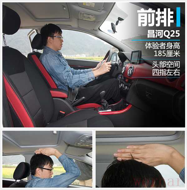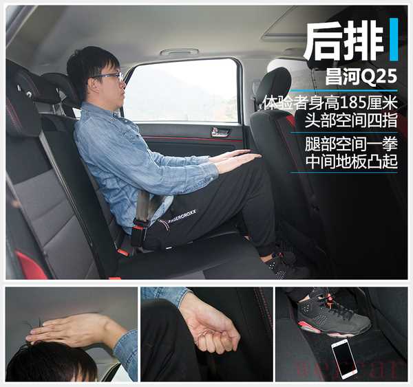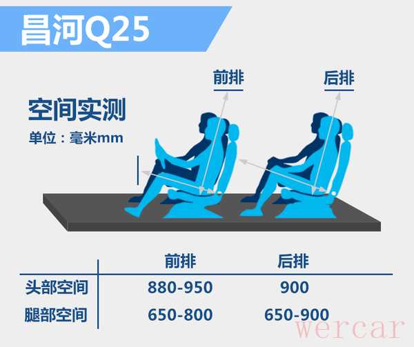 昌河Q25长宽高尺寸为4095*1750*1545(带行李架1583)毫米,轴距为2519毫米,与同级车型江淮瑞风S2、哈弗H1相比,其轴距数据拥有绝对优势,同时在长度与宽度方面也表现不错,这为车内空间的进一步优化奠定了基础。从实测数据来看,该车在前排及后排均拥有高达900毫米的纵向乘坐空间,表现值得称赞。