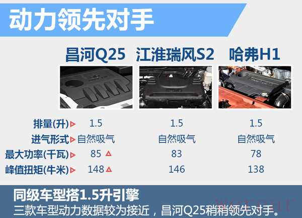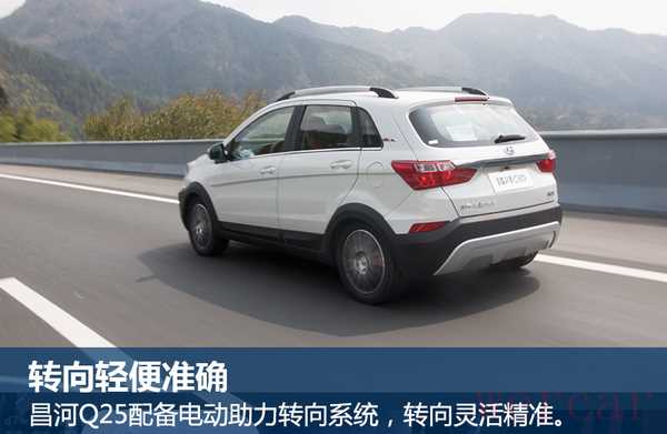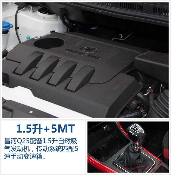 昌河Q25配备的代号为A151的1.5升CVVT自然吸气发动机,配备怠速启停功能,强调动力输出与节能环保性能的平衡。该发动机最大功率可达85千瓦/6000转/分,峰值扭矩148N牛·米/3800转/分,匹配5速手动变速箱后,百公里综合油耗为6.1升。在同级车型中,这款发动机的账面数据是最高的,在之后的动态驾驶中也有所体现。