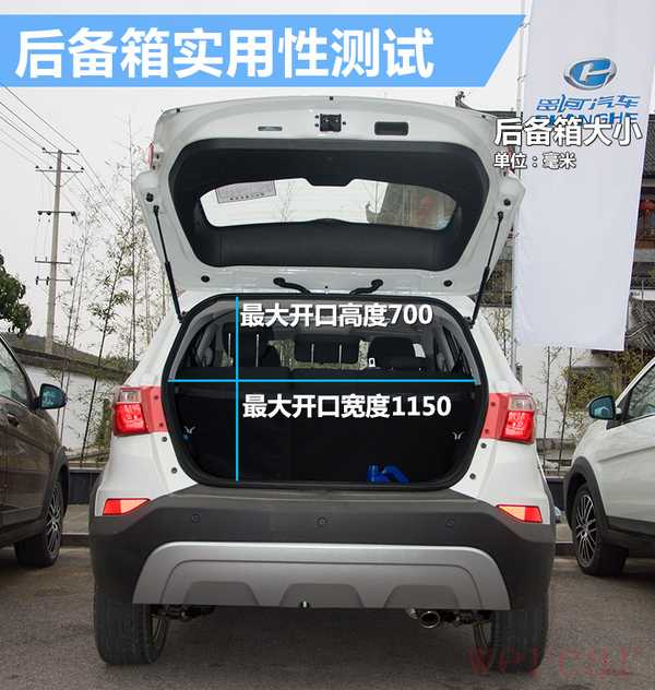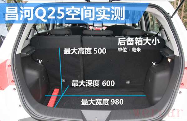 昌河Q25后排座椅可按4/6比例进行拆分放倒,在运输大件行李时十分便利。但在后排拥有乘坐者的情况下,后备箱还需以常规的方式安放物品。从实测数据来看,该车后备箱横向空间表现不错,在纵向及深度表现方面只能算中规中矩。值得一提的是,后备箱的最大开口为1150毫米、最大高度均为700毫米,在取放大件物品时较为便利。