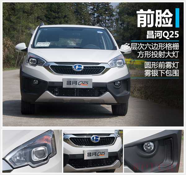 作为昌河旗下首款SUV产品,Q25开创了全新家族式设计语言,几经雕琢打造的个性外观十分抢眼,你很难把它与印象中的“昌河汽车”联系在一起。新车前脸造型时尚动感,上格栅采用黑色网状结构设计,并采用宽阔的镀铬饰条勾勒轮廓,视觉效果十分出色。双侧头灯组采用不规则造型设计,并向两侧大氛围延伸,增强侧面视角的视觉冲击力。下格栅同样采用黑色网状结构并延伸至雾灯区域,搭配亮银色下唇,使前脸整体造型更加动感。