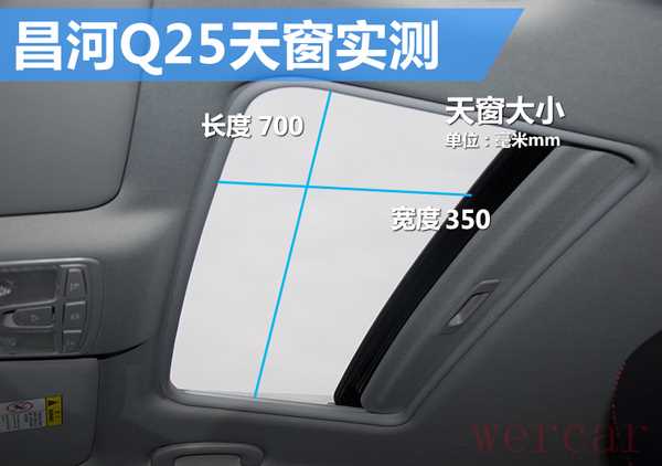 对于一款起售价在5万元左右的小型SUV而言,天窗无疑是个略显“奢侈”的配置,不少同级车型仅在顶配车款才提供选装。昌河Q25为前排乘客提供了小尺寸天窗,长度、宽度分别为700*350毫米,为驾乘者提供了更加舒心的驾驶氛围,为其加分不少。