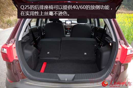 另外比较让人满意的一点是,Q25在车内路噪和风噪的控制上比较突出。即使是以100Km/h左右的时速行驶,车内所能听见的只是发动机工作的声音。对于这个价位的车型,在噪音振动的控制上恐怕不能要求太多。