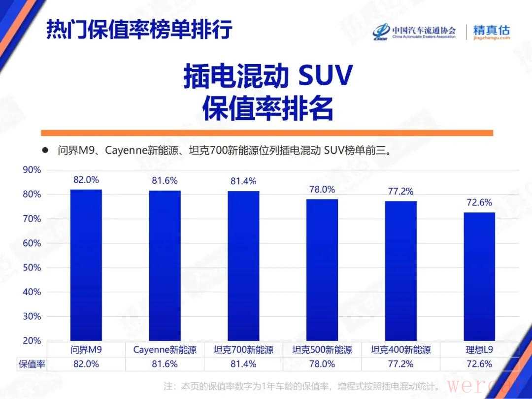 从具体车型来看,8月纯电动车一年车龄保值率前三为小米SU7、问界M9、理想MEGA,前15名中国产品牌占比超七成,各级别车型均有上榜;插混车型一年车龄前三是问界M9、保时捷Cayenne插混、坦克700新能源,自主品牌同样势头强劲,在榜单中占比颇高。