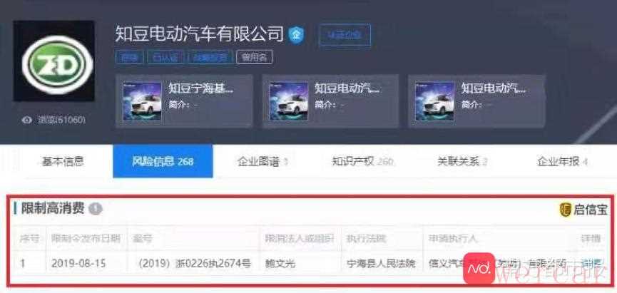 南都记者查阅启信宝了解到,8月15日,知豆电动汽车有限公司新增限制高消费信息,被限制高消费的为鲍文光,他正是知豆电动汽车创始人,也是知豆电动汽车有限公司的法定代表人,申请执行人为信义汽车部件(芜湖)有限公司,案由为买卖合同纠纷。信义汽车部件(芜湖)有限公司为信义集团(玻璃)有限公司控股公司,后者是国内大型的汽车零部件供应商集团。