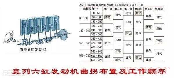 直列六缸发动机还有另外一种工作顺序,1-4-2-6-3-5,。通常把第一种称为右式,第二种称为左式。