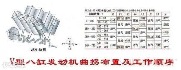 V型八发动机的发火间隔角为720°/8=90°,4个曲拐互成90°。工作顺序基本上有两种:R1-L1-R4-L4-L2-R3-L3-R2、L1-R4-L4-L2-R3-R2-L3-R1,也可以简述为:1-5-4-8-6-3-7-2、1-5-4-2-6-3-7-8。