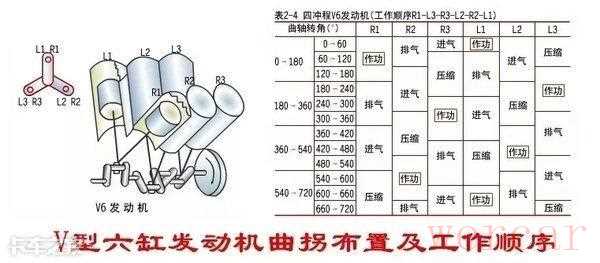 V型六缸发动机的发火间隔角仍为120°,3个曲拐互成120°。工作顺序R1-L3-R3-L2-R3-L1。面对发动机的冷却风扇,右列气缸用R表示,由前向后气缸号分别为R1、R2、R3;左列气缸用L表示,气缸号分别为L1、L2和L3。也可以简述为:1-6-3-5-2-4.