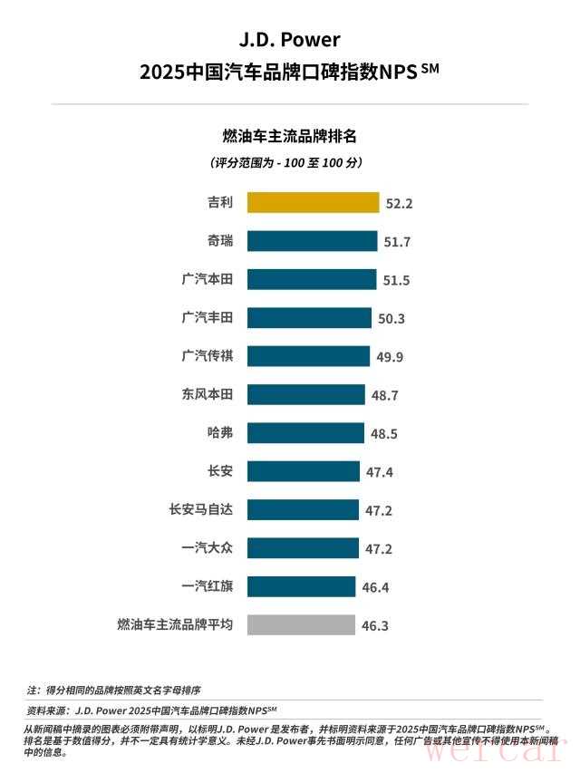 在燃油车依然占据重要市场份额的当下,选择那些口碑过硬、服务完善的品牌,无疑能让用车生活更加安心。根据J.D. Power发布的2025年中国汽车品牌口碑指数(NPS)燃油车榜单来看,整体呈现出令人耳目一新的竞争格局。吉利汽车以52.2分的成绩夺得榜首,奇瑞以51.7分紧随其后,国产车再次包揽了冠亚军位置。广汽本田、广汽丰田等日系品牌分别位列第三和第四,依然保持着稳定的口碑表现。这份榜单最引人注目的变化在于——自主品牌不仅实现了突破,更在口碑这个关键指标上展现出了超越合资品牌的实力。千万别乱买!2025中国汽车口碑排行出炉:吉利登顶,本田长安前10!