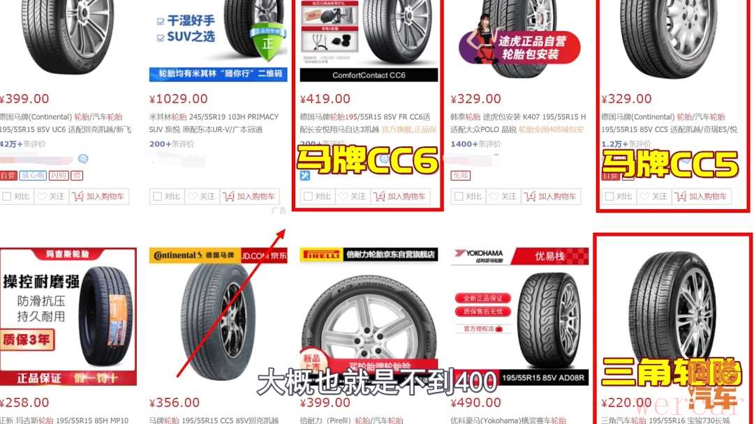 接下来喵哥再带大家看一下,很多十几万这个级别的普通家用轿车,很多都在用的195/55/R15这个尺寸的轮胎。我们可以看到马牌的CC6,大概也就是不到400,马牌的CC5就只有300出头,同样的可以看到国产的三角的也就是220。按照喵哥的经验,我今年上半年换马牌的CC6,当时在搞活动的时候大概在300出头就能买到,所以说这两款轮胎,国产的跟一线品牌的它们之间的差价也就在100块钱左右,4条轮胎换下来也就是400块钱差价。