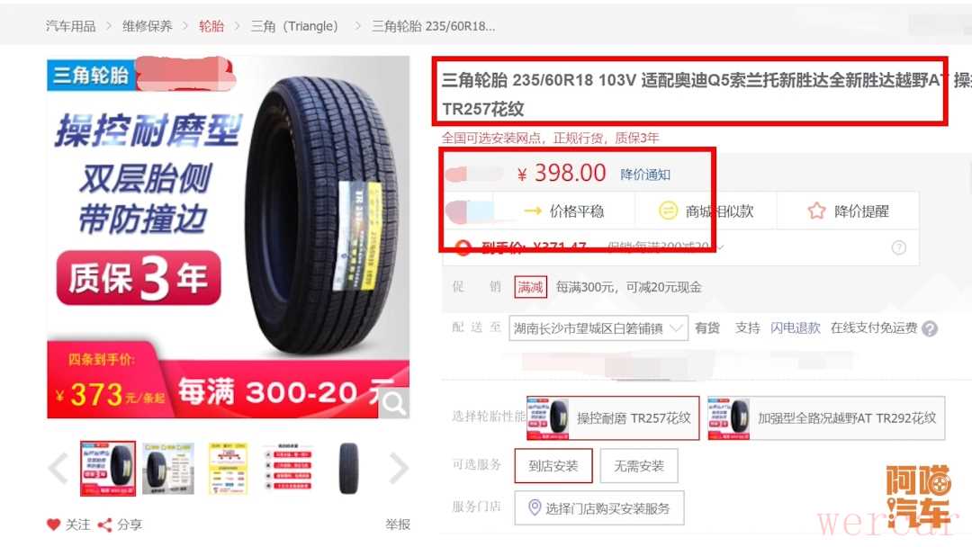 如果换成其他品牌的轮胎,比如说像国产的三角,同样的是235/60/R18的,后面的参数差别也不太大,它的价格就只有不到400块一条,单条轮胎的价格差距达到了600多,而且按喵哥的了解的情况,三角这条轮胎比米其林这条轮胎,它的耐磨性更好一些,只不过三角轮胎更硬一些,它的舒适性比米其林轮胎要差一些。