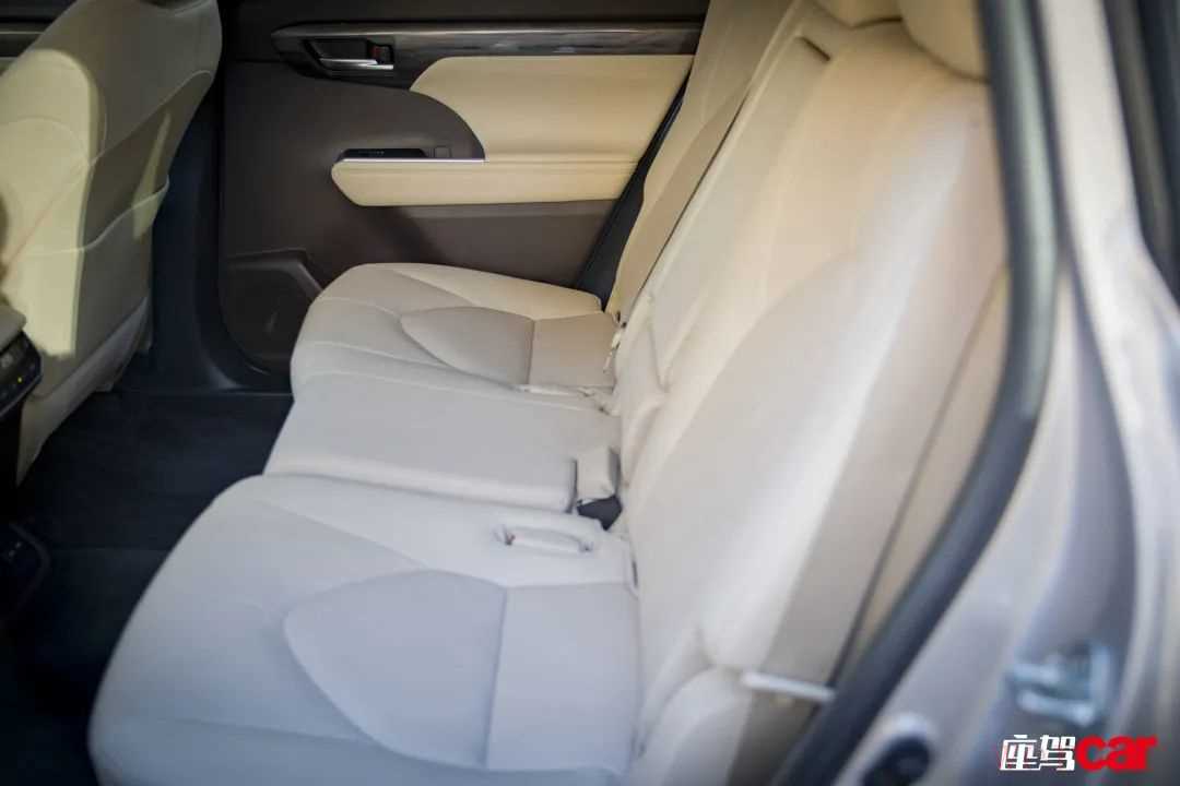 储物空间方面也有所提升,除了门边、中央扶手箱、手套箱这种常规位置外,我们还能看到例如中控屏下方设有夹层,并且一直贯穿至副驾位置,我们可以在这些夹层中放置手机、票据等杂物,十分贴心。再提一个小点,中控屏下方的夹层隔板中还刻意留了一个小洞,方便手机充电线的收纳与归拢。我常与朋友们分享,尽管丰田车过往的内饰相比德系、美系车要略逊色,但它在细节之处所表现出的那份温馨感却十分到位,对于日常实用性很有帮助。乘坐舒适性方面,前两排座椅造型相对宽大,乘坐舒适度表现不错,第三排空间比较局促,座椅的舒适度也较为普通,这是7座车普遍的问题,毕竟第三排同时肩负着被折叠后增加后排空间的作用。