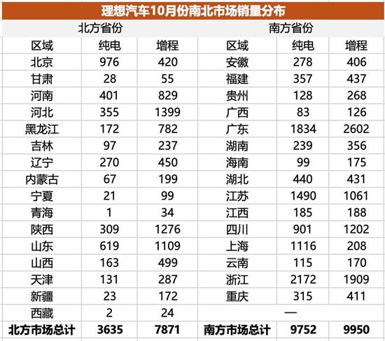 如上表,今年10月份理想品牌纯电和增程车型的销量,分别是1.15万和1.97万辆,其在南方市场纯电和增程车型的销量都达到了近万辆,两种动力几乎持平。