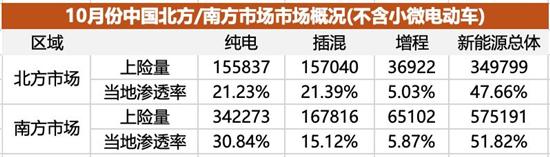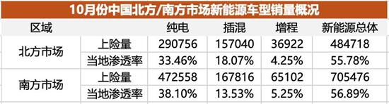 从总体的新能源车渗透率来看,南方市场贡献了全国59.3%的新能源车销量,北方只有四成出头。但是看新能源车渗透率的话,南北市场目前是非常接近的,10月份北方新能源车渗透率为55.78%,仅比南方略低了1.1个百分点,两大区域的差异,体现在不同动力车型的销量。