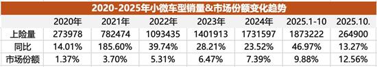 以上是将所有车型都囊括在内的整体情况,而此前我们分析过纯电小微车市场的概况,可以看出这类被定义为城区代步车的类别,在近期的膨胀速度极快。尤其是在今年,1-10月纯电小微车的销量同比大涨了47%,10月份在整体市场中的份额达到了12.6%,而在去年,小微电动车的份额还只有7.4%。