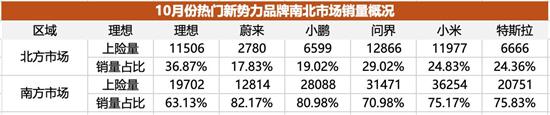 上表我们统计了7个热门新势力品牌10月份在南北市场的销量情况,这些品牌中除了小鹏旗下的MONA M03外,其余主销产品都集中在20万元以上的中高端市场。