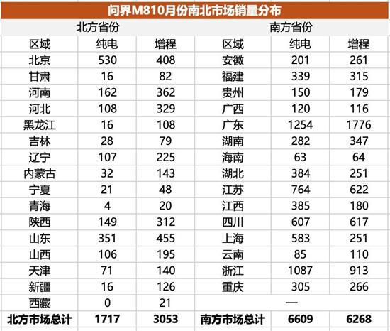在南方市场,问界M8纯电版的销量达到6609辆,比增程版多了300多辆,而在北方市场,纯电版的销量只有1717辆,和增程版的3053辆也差了将近一倍。