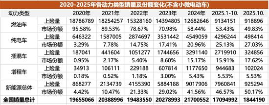排除小微电动车后,纯电市场在今年的销量增长依然非常强劲,1-10月累计市场份额,从2024年的20.96%增长到了25.1%,增速明显超过了2022和2023年。