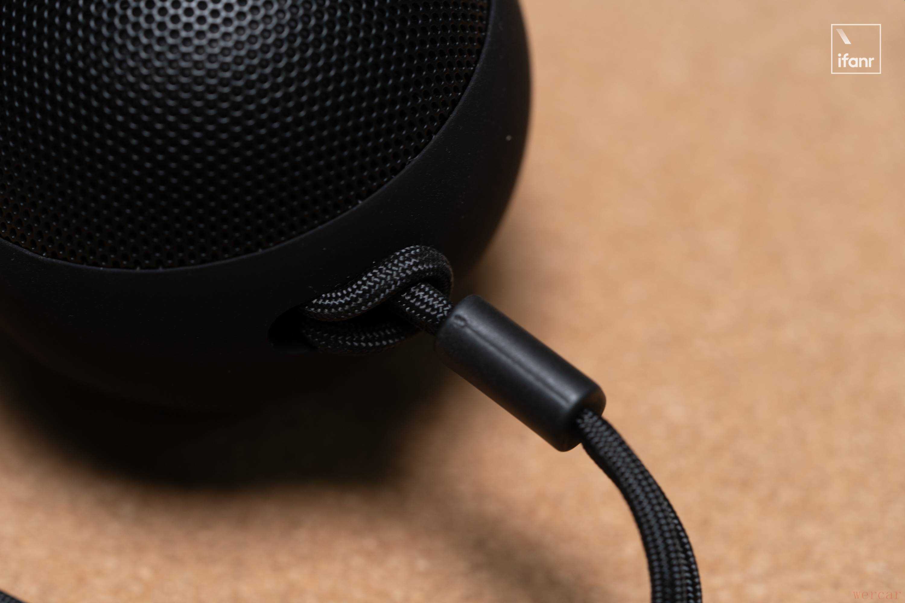 机身侧边附带了一个挂绳孔,出厂时就会装好原装挂绳,让音箱能直接挂在背包外面,或者是扣在水壶袋子上。绳子还是挺粗的,挂在背包上也不怕被扯断。挂绳开孔预留了足够空间,想要挂登山绳也可以。