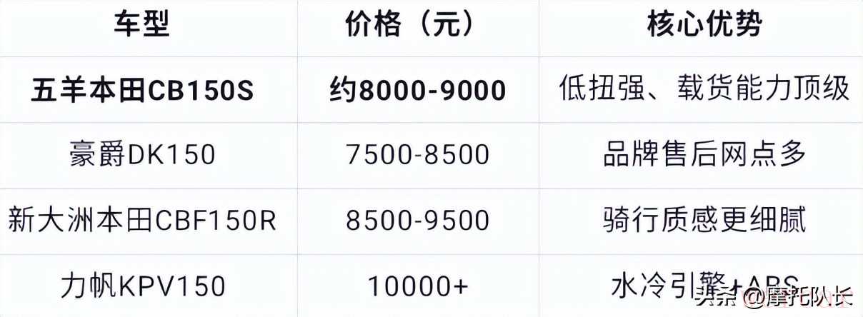 结论:如果你纯实用导向,CB150S是同价位载货能力最强的选择;如果稍微追求点品质,加钱上力帆KPV150更全能。