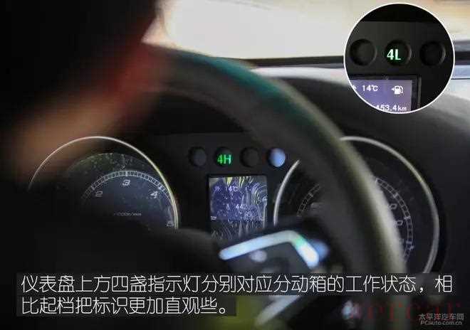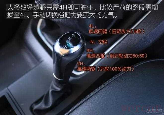 柴油版BJ40L分动箱支持四种模式,采用的是手动切换档把,除了空档、高速两驱之外,还有低速四驱、高速四驱模式。其中,低速四驱适用于短时间且高强度的越野路段,例如陡峭草坡、泥泞路段。在此模式下,扭矩会倍放大2.5倍,挂1档起步时,驱动力提升明显;而高速四驱则适用于则适用于全程山路的轻越野路段。
