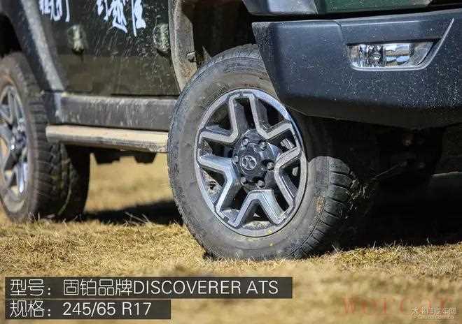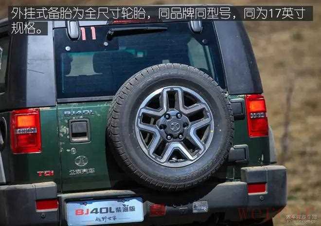 柴油版BJ40L/BJ40全系均标配固铂品牌的DISCOVERER ATS全地形轮胎,轮胎规格为245/65 R17,配以双色五星铝合金轮毂。车尾外挂着全尺寸备胎,这点还是很实在的。