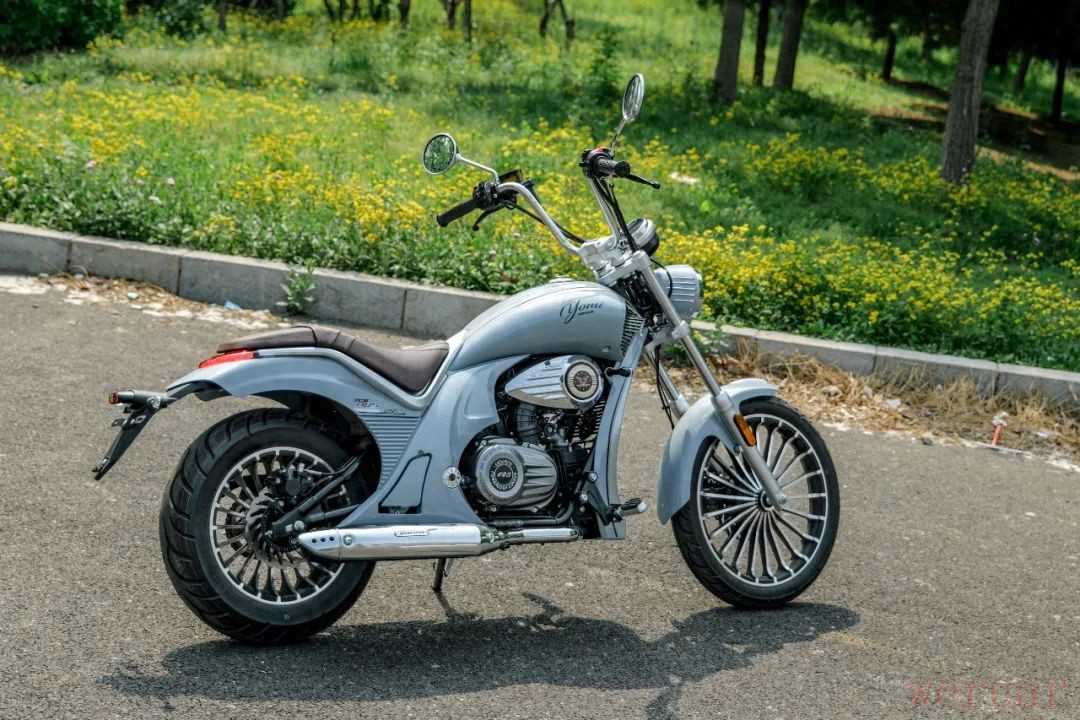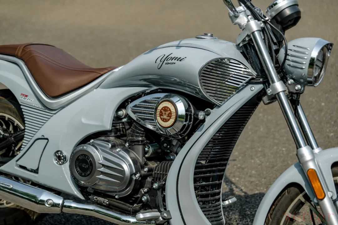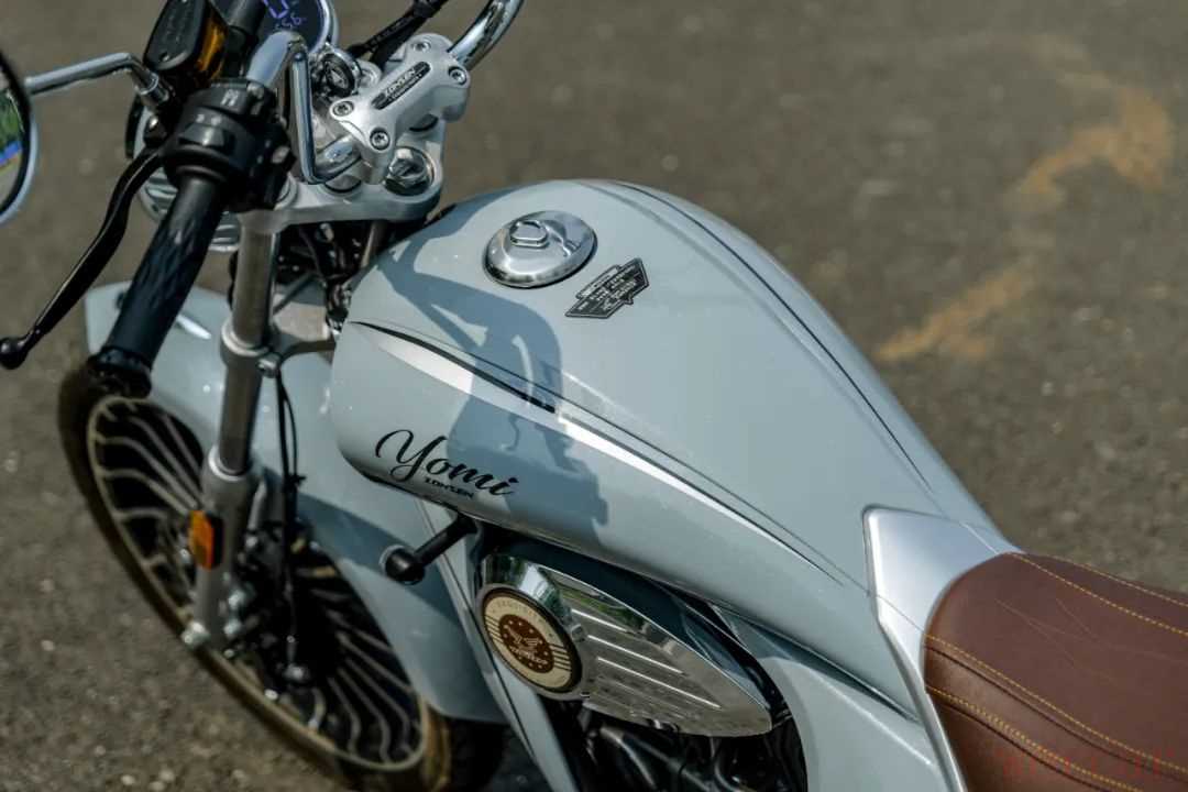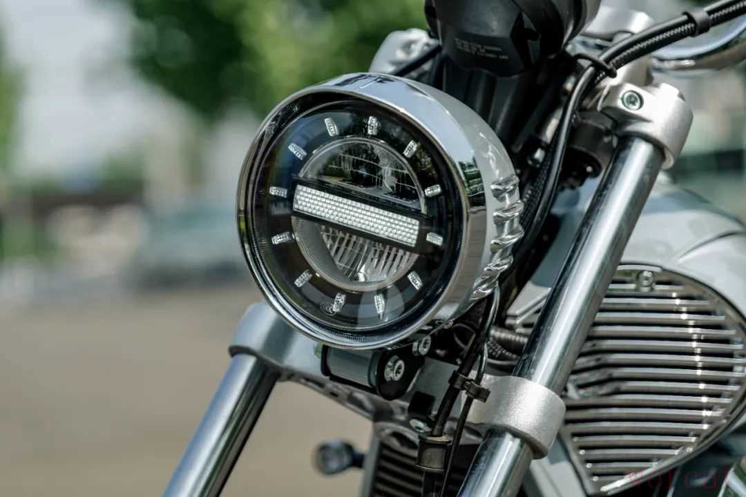 YOMI的外观堪称跨骑界的“显眼包”,其设计跳脱传统巡航车的框架,将美式Chopper的高把、低座、长轴距元素与东方审美巧妙结合。车身线条流畅优雅,水滴形油箱采用钢琴烤漆工艺,搭配镀铬竖琴格栅装饰罩,复古中透露出精致感。前大灯的号角造型与LED光源设计,既呼应经典又兼顾实用性,夜间辨识度极高。尾部的“海洋之心”心形尾灯更是点睛之笔,赋予整车浪漫气息。