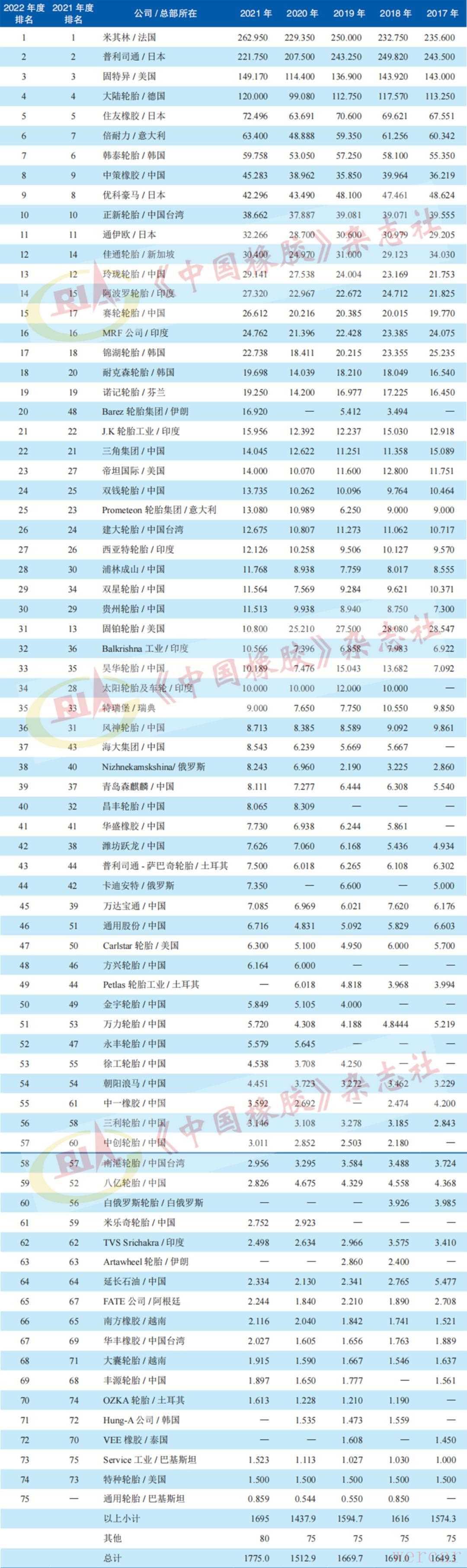 8月29日,美国《轮胎商业》正式发布2022年度全球轮胎75强排行榜。