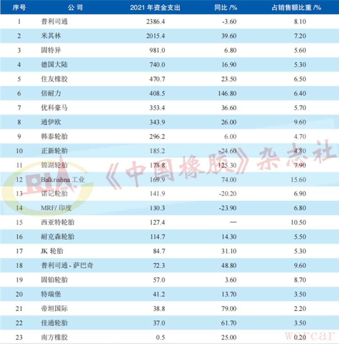 按2021年度财务预算资本支出额排名,普利司通、米其林及固特异居前3位。按资本支出/销售收入率排名,Balkrishna工业、西亚特及通伊欧分别以15.60%、10.50%、9.60%居前3位。