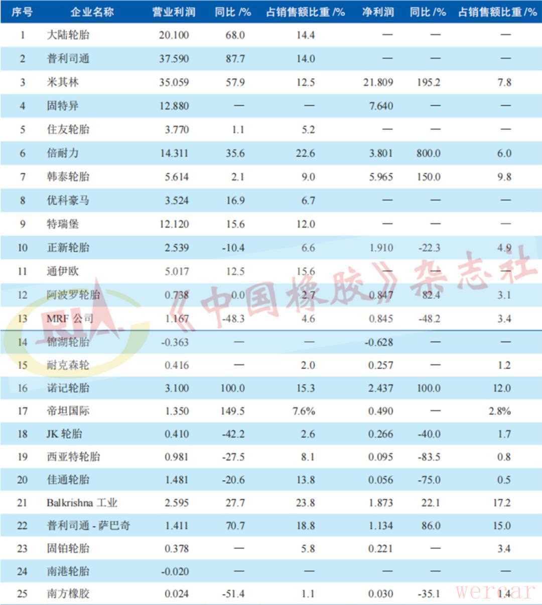 从最近陆续公布的半年报看,主要轮胎制造商营业利润及净利润率继续呈现增长态势。
