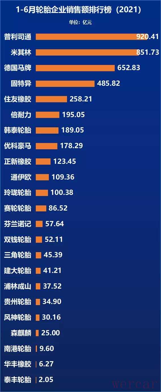 小邦将23家轮胎企业的半年销售额进行对比,普利司通销售额为920.41亿元,米其林为851.73亿元,继续位居全球第一、第二。
