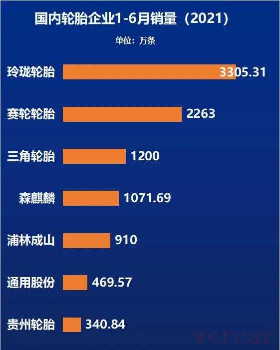 从8家国内轮胎企业的半年销量来看,玲珑轮胎半年销售了3305.31万条,赛轮销售了2263万条,三角轮胎销售了1200万条,这三家排在前三位。